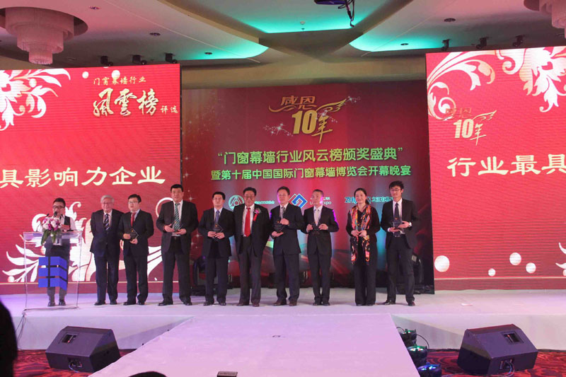 2012年11月23日,由中國(guó)建筑金屬結(jié)構(gòu)協(xié)會(huì)主辦的“感恩十年——門窗幕墻行業(yè)風(fēng)云榜評(píng)選”頒獎(jiǎng)盛典在北京舉行。經(jīng)過2個(gè)月的激烈角逐,我公司以絕對(duì)優(yōu)勢(shì)高居加工設(shè)備類榜首,榮獲一呼百應(yīng)大獎(jiǎng)——最具影響力企業(yè)獎(jiǎng)。